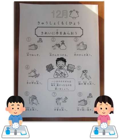 12月の給食目標です。12月の目標は『きれいに手をあらおう』です。11月は、下痢や嘔吐、腹痛など、胃腸炎による欠席が多くありました。特に食事の前には、ていねいに手洗いをするよう、心がけていきたいものです。毎日、新しいハンカチもお願いします。