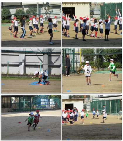 2年生の体育の学習の様子です。今日のリレーでは、コースの途中にハードルや輪を置き、それをくぐるということも行いました。走る友達に、仲間から大きな声援が飛んでいます。