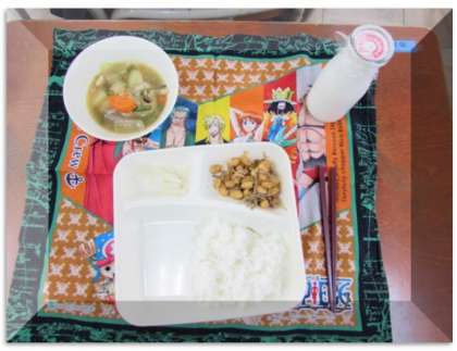 本日の給食の献立をご紹介します。本日の献立は、ご飯、鶏肉と野菜の煮物、じゃこ豆、かぶのゆず風味、牛乳でした。