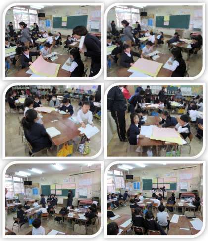 本日、1年生の学級で研究授業を行いました。算数「どちらがひろい」の学習です。『身の回りにあるものの面積に関心を持ち、直接比較で比べることができる』というめあてで取り組みました。子どもたちは、形の違う2枚の紙の広さを比べようと、話し合い、班ごとに考えをまとめていきました。大勢の先生が参観する中、しっかりと考え、発表することができました。
