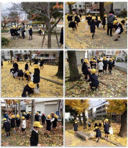 本日、1年生は公園探検で、田端公園に行きました。田端公園では、たくさんの落ち葉を拾い集めました。黄色や赤、茶色の葉を、たくさん拾うことができました。