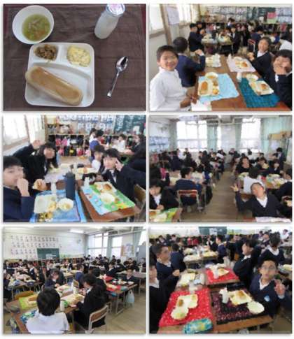 画像は、楽しく給食をいただく5年生の子どもたちです。