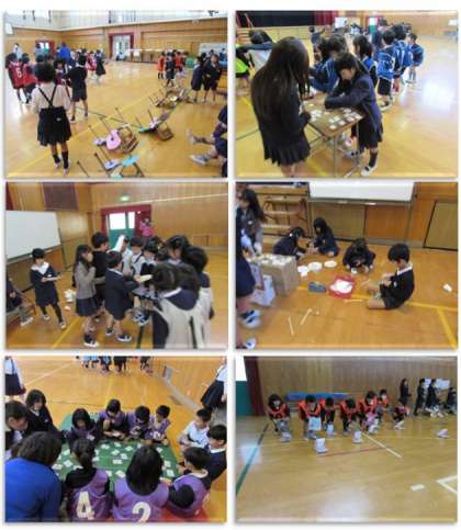 本日、2年生は1年生を招いて、『あそび交流会』を行いました。生活科で学んだことを生かし、また、昨年自分たちが1年生の時に、2年生と一緒に遊んだことを思い出し、今日のあそび交流会を行いました。班ごとに遊びを考え、遊び道具を作り、遊び方の説明の仕方を考え、楽しい交流会になるよう、頑張りました。遊びの後には、一緒に歌を歌ったり、じゃんけん列車をしたりしました。1年生も2年生も、『また一緒に遊ぼうね』と、笑顔で交流会を終えました。