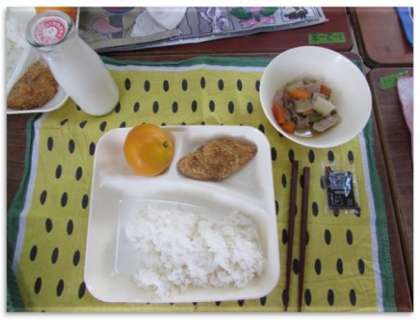 本日の給食の献立をご紹介します。本日の献立は、ごはん、まぐろのフライ、豚肉と大根の煮物、みかん、牛乳でした。