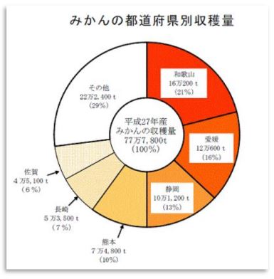 みかん、というと、温州みかんのことをいうことが多いです。いちばんたくさんとれるのは和歌山県で、約16万トンとれます。愛媛県、静岡県、熊本県、長崎県、佐賀県も、たくさんとれます。