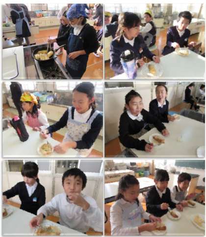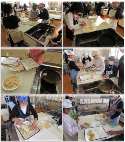 料理クラブは、フィリピンのおやつ『バナナトロン』に取り組みました。作り方は、切ったバナナに砂糖を付け、春巻きの皮で包んだものを油で炒めるというものです。出来上がった『バナナトロン』は、とってもおいしかったです。