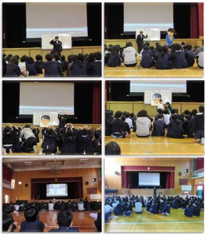本日の3時間目、西成警察署の方にお越しいただき、1年生から4年生を対象として防犯教室を行いました。今日の防犯教室では、『誘拐されないために』ということでお話をしていただきました。誘拐しようとする人の好きな子どもは『ひとりでいる子』、誘拐しようとする手立ては、