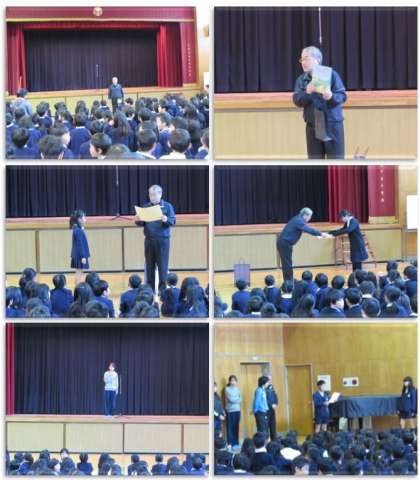 続いて、夏休みの自由研究作品の賞状授与がありました。『貯金箱コンクール』で3年生の児童が、『We loveトンボ』で6年生の児童が、賞状と賞品を受け取りました。
