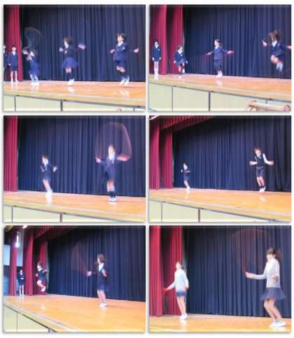 最後に、体育委員会から、各学級1人ずつ、縄跳びのお手本を跳んでください、という案内があり、1年生から順に、舞台で縄跳びを披露しました。1年生では前回し、あや跳び、2年生以上では2重跳びでびゅんびゅん跳んでいました。