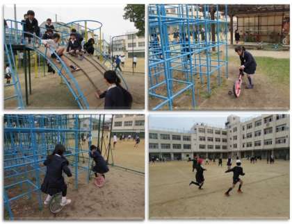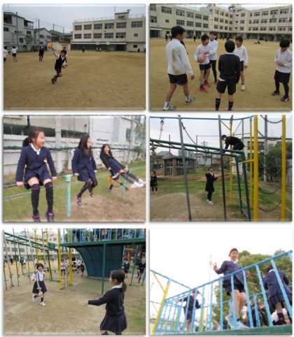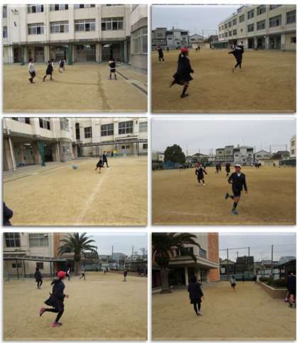 掃除が終わって、お昼休みの運動場の様子です。本日の大阪市の最高気温は10度、ということでしたが、子どもたちは寒さに負けず、元気に運動場で遊んでいます。