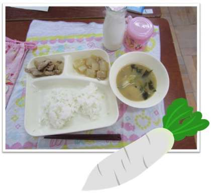 大根は、汁物や煮物、和え物などに使われます。12月の給食では、『さばのみぞれかけ』『冬野菜のカレーライス』などに使われています。