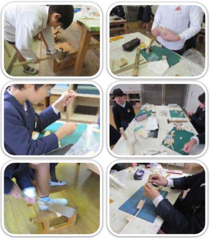 4年生の図画工作『トントンつないで』です。のこぎりで木を切り分けた子は、釘を使ってつないでいます。『安全』をいちばんの目標として、けがをすることなく取り組んでいます。