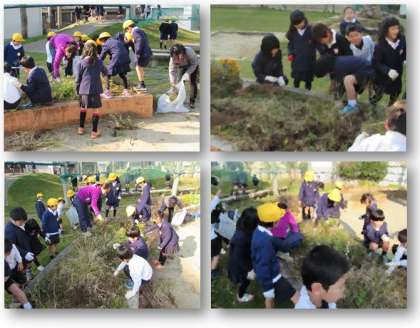 1年生が、学習園の草抜きをしています。太くて、枯れた草がたくさんありましたが、みんなで力を合わせて学習園をきれいにしました。