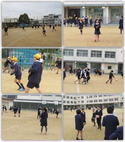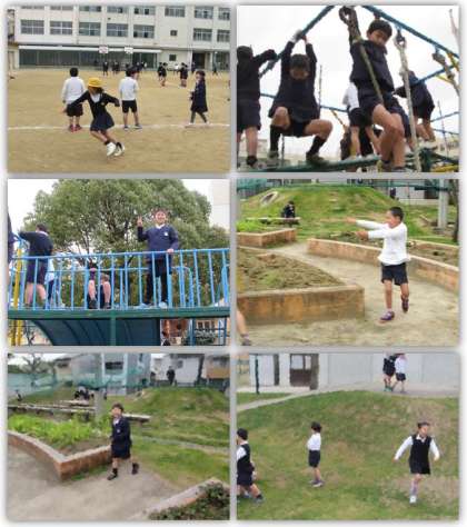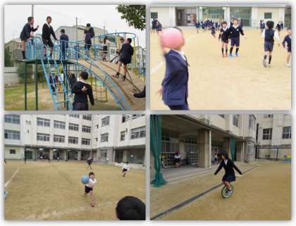 休み時間の運動場の様子です。子どもたちが元気いっぱい、遊んでいます。