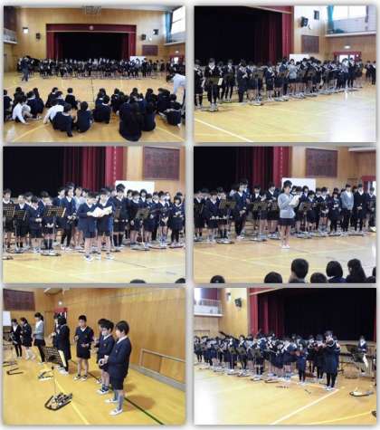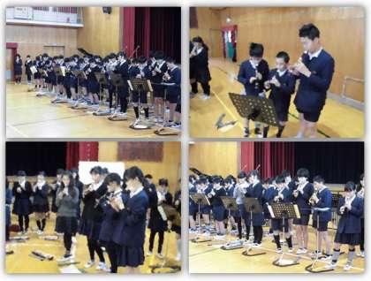初めに、6年生から音楽のプレゼントです。リコーダーで『あわてんぼうのサンタクロース』『きよしこのよる』を、器楽合奏で『星に願いを』を奏でました。その演奏の素晴らしさに、1年生の子どもたちも「あんなふうにリコーダーを吹きたい!」という気持ちになっていました。