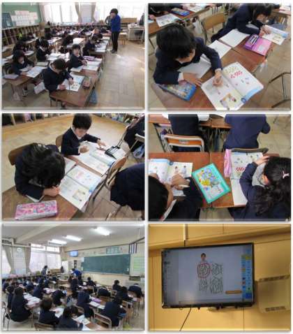 1年生の算数の学習の様子です。教科書の数え棒を数える方法を考えていきました。そして、テレビに教科書を映し出し、10本ずつまとめることで数えやすくなることを確かめました。
