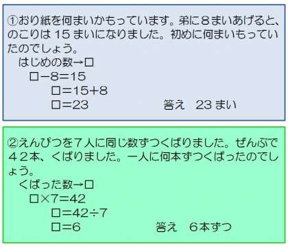 3年生の算数の学習です。今日は、わからない数を□を使って表す学習で、ひき算やかけ算になる場合の答えの求め方を考えました。