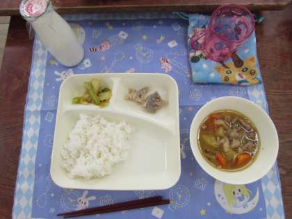 本日の給食の献立をご紹介します。本日の献立は、ご飯、さつまいもと豚肉の甘辛煮、れんこんの米粉天ぷら、牛乳でした。