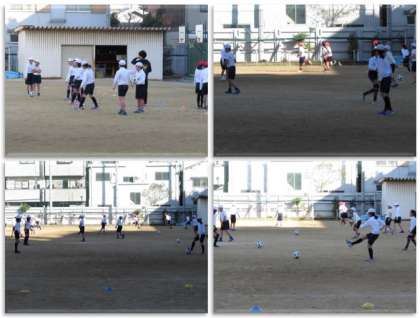 5年生の体育の様子です。初めに運動場を走って体を温めました。その後、今日の体育はサッカーです。