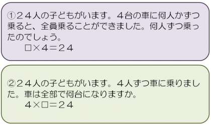 3年生の算数の学習です。かけ算の式で、数字が同じでも求める答えが違う2つの式を考えました。