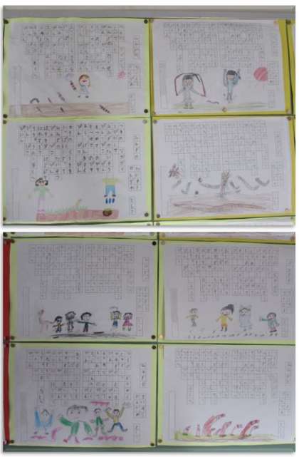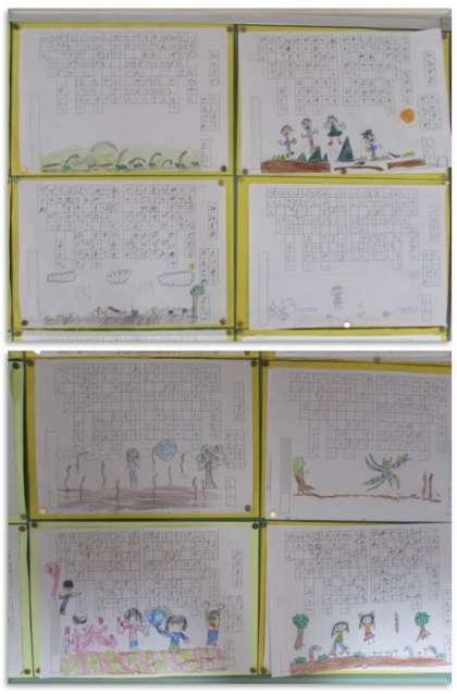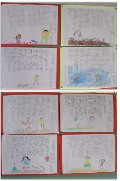 1年生の詩の視写「みみずのたいそう」です。リズミカルな、楽しい詩です。子どもたちは、詩から想像したものを描いています。