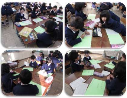 1年生が、算数プリントを整理しています。色画用紙で作った台紙に、ていねいに貼っていきました。