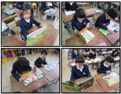 水曜日の朝は、読書タイムから始まります。1年生の子どもたちが、集中して読書に取り組んでいます。