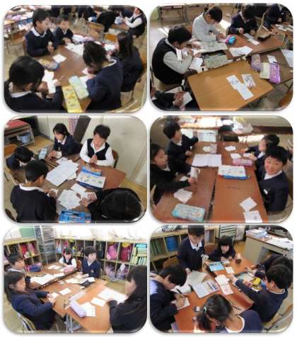 2年生の国語の学習です。皆でかるたを作っています。手作りかるたで遊ぶのが、楽しみです。