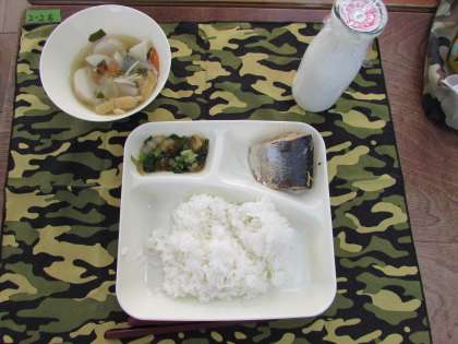 本日の給食の献立をご紹介します。本日の献立は、ご飯、牛乳、サバの味噌煮、五目汁、きくなとはくさいのおひたしでした。