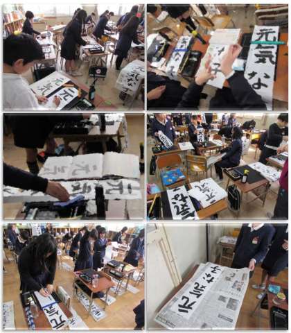 本日、4年生は書き初めに取り組みました。『元気な子』と書きました。横画、縦画、とめやはねなどに気を付けて、書いていきました。