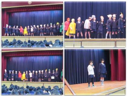 本日の集会は、給食委員会の発表です。3色栄養のはたらきを伝え、皆で栄養の歌を歌いました。栄養のバランスを考え、好き嫌いをせずしっかりと食べるようにしてほしいと思います。