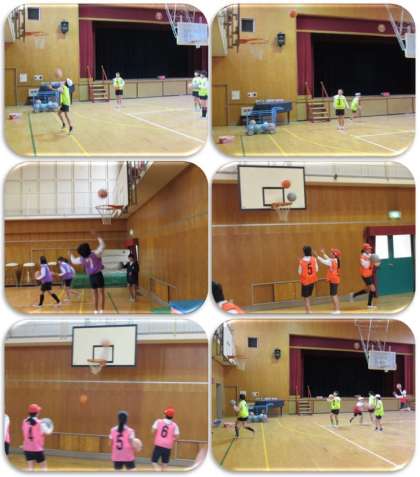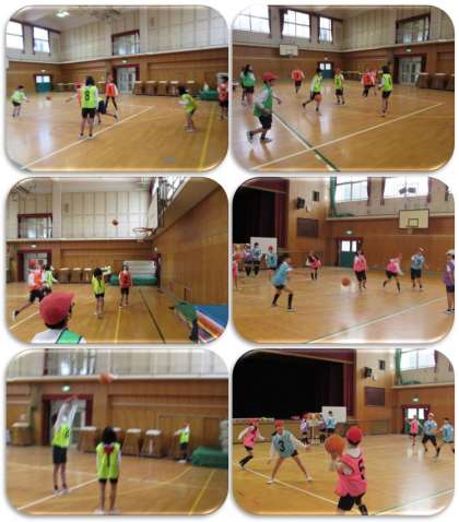 6年生の体育です。バスケットボールに取り組んでいます。画像1段目から3段目はシュート練習、4段目から6段目はゲームの様子です。