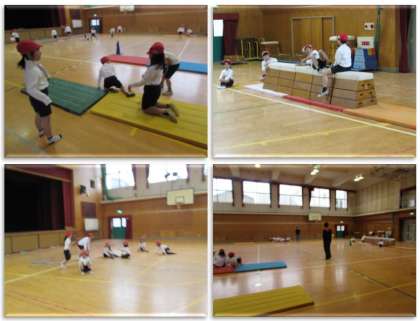 体育館での2年生の体育の様子です。マットや跳び箱、フラフープを使って、アスレチックを行いました。