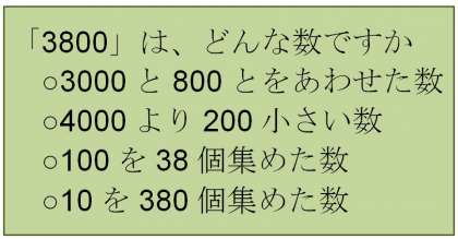 2年生の算数の学習です。「3800」という数について、どのような数といえるのか考えていきました。