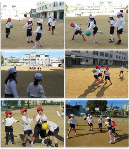 2年生の体育の様子をご紹介します。運動場で、的当てゲームを行っています。的にボールを当てようと、そしてボールを当てられないようにしようと、どちらも必死になっています。