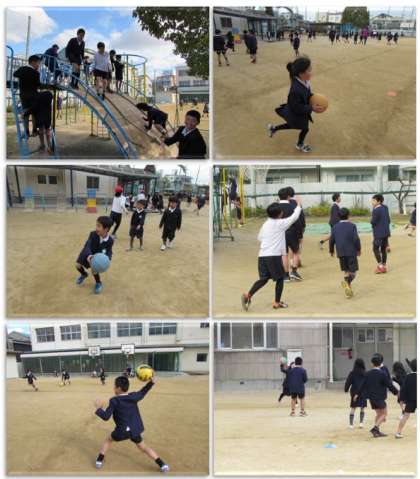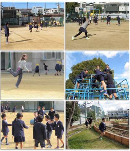 休み時間の運動場です。子どもたちが元気に遊んでいます。
