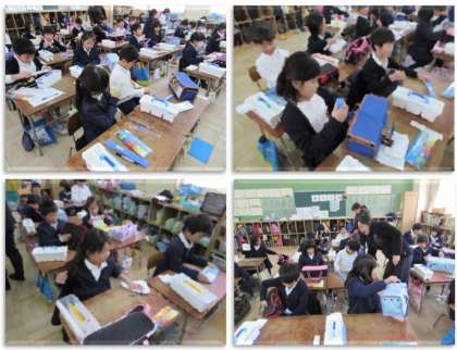 1年生の図画工作の学習です。今日は初めての絵の具の学習です。道具の使い方を一つ一つ、確かめています。