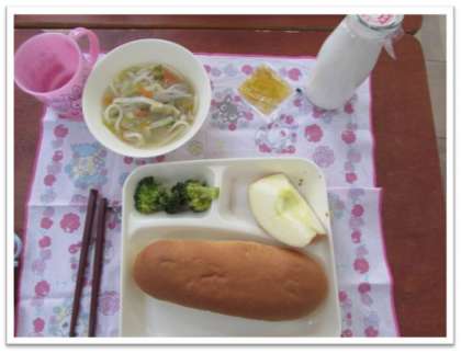 本日の献立は、コッペパン、マーマレード、五目うどん、ブロッコリーの胡麻和え、りんご、牛乳でした。