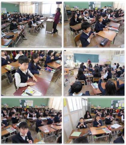 4年生の音楽の学習です。初めに「アルプス一万尺」に合わせて、手を叩いたり、机を叩いたり、足を踏み鳴らしたり、リズム打ちをして楽しみました。