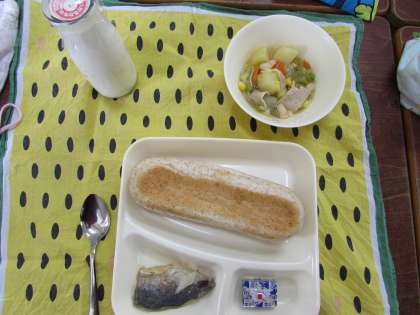 本日の献立は、ライ麦パン、あじのレモンマリネ、スープ煮、固形チーズ、牛乳でした。