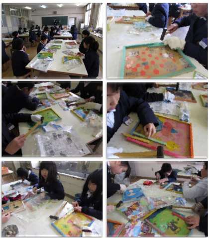 3年生の図画工作の学習です。コリントゲームで、今日はいよいよ釘打ちです。釘が1cm5mmほどで短く、金づちを使うのも初めてで、緊張しながら、けれども慣れるととんとんと、けがなく活動することができました。