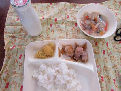 本日の献立は、ご飯、鶏肉の甘辛焼き、かす汁、くりきんとん、牛乳でした。