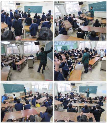 画像は、英語で数を言いながら、特定の数のところでジェスチャーを入れるゲームをしている場面です。