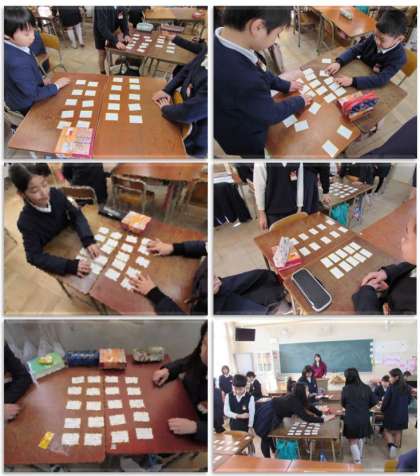 4年生の国語の学習です。百人一首大会を行っています。1対1で、真剣勝負です。上の句だけを聞いて取ることができる札が、ずいぶんと増えました。