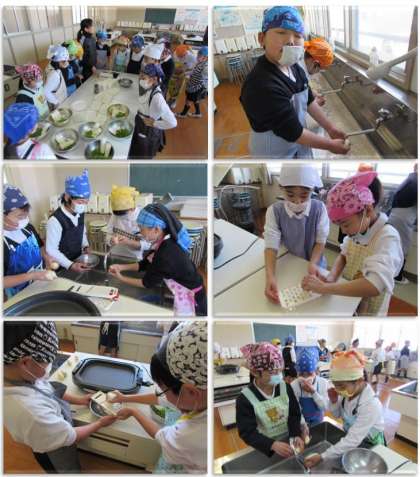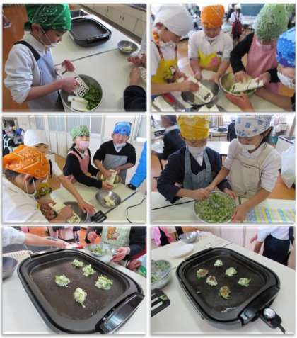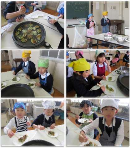 3年生の総合学習です。学習園で収穫した田辺だいこんを使って、だいこんもちを作りました。班で協力して、だいこんを洗い、おろし、葉と混ぜて焼きました。出来上がっただいこんもちは、とてもおいしかったです。