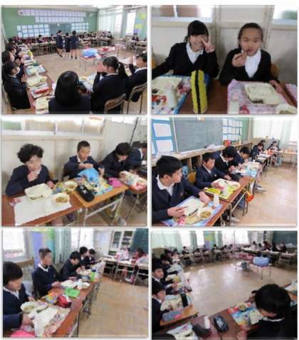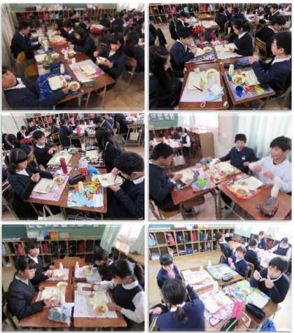 6年生の教室をのぞくと、皆が楽しそうに給食をいただいていました。