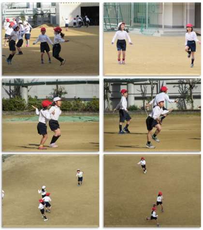 縄跳びに続いて、おにごっこを行いました(画像下)。