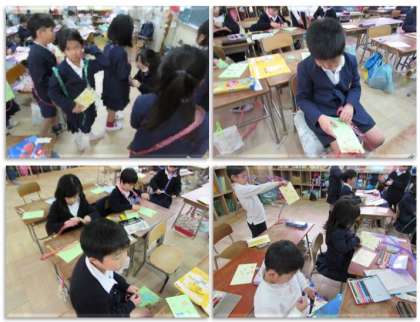 1年生は、2月9日(木)、幼稚園・保育所の子どもたちとの遊び交流会を行います。画像は、幼稚園・保育所の子どもたちにかけてあげるかばん(手作りおもちゃを入れる)を作っているところです。