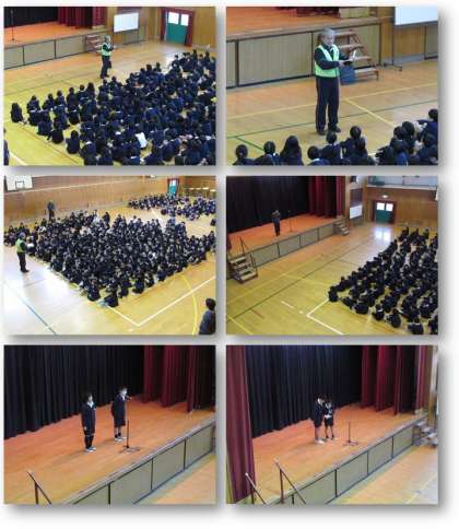 初めに、学校長の話です。夜、空を見上げると、南から西の空にかけて、オリオン座が見えたという話、先週、住之江区で小学1年生の子どもが公園で事故にあったニュースについての話、西成区役所に、千本小学校の子どもが出した書き初め展の入選作品が展示されています、という話でした。