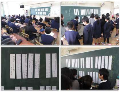 6年生の国語の学習「句会を開こう」です。各自が作った俳句を黒板に貼り、品評会です。無記名なので、どれが誰の作品かわかりません。じっくり読んで、いいな、と思った句に子どもたちはシールを貼っていきました。さて、一番人気はどの句だったのでしょう。